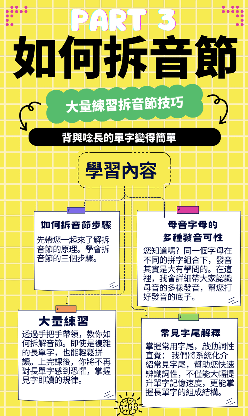 核心目標: 大量練習拆音節技巧,讓記憶與拼讀長單字變得簡單。