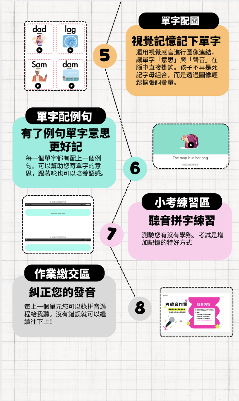 ✅拼音影片:提供系統化例字練習,透過規律循環將技巧內化為語言直覺。