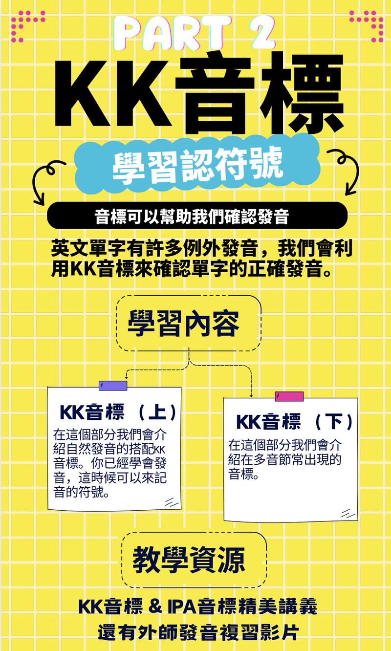 🔵 KK 音標 (上):介紹自然發音搭配 KK 音標。當學會發音後,再學習記錄聲音的符號。